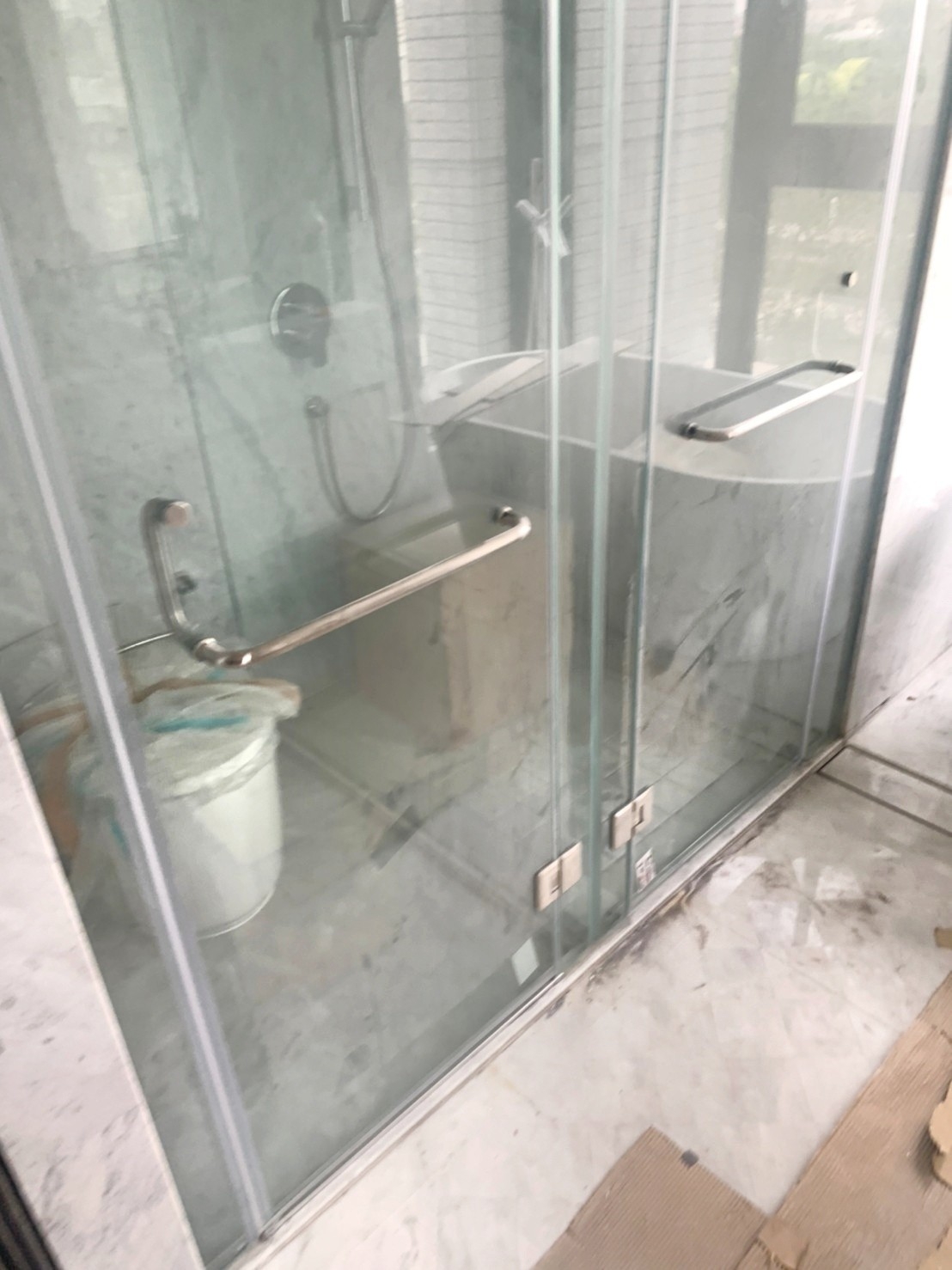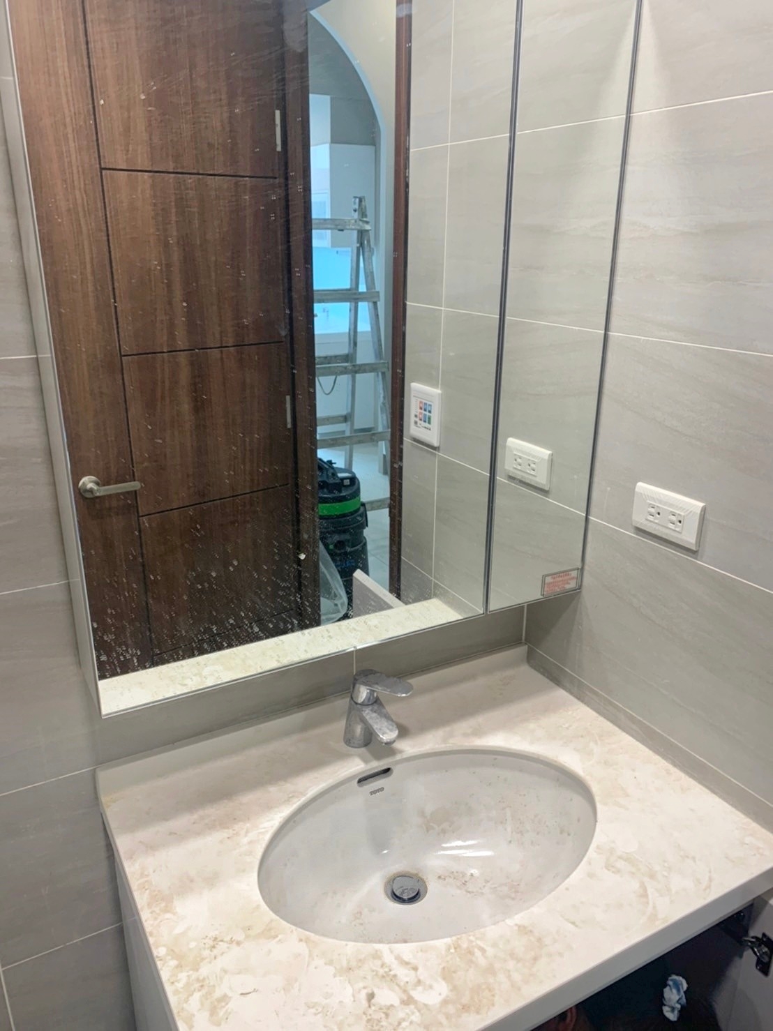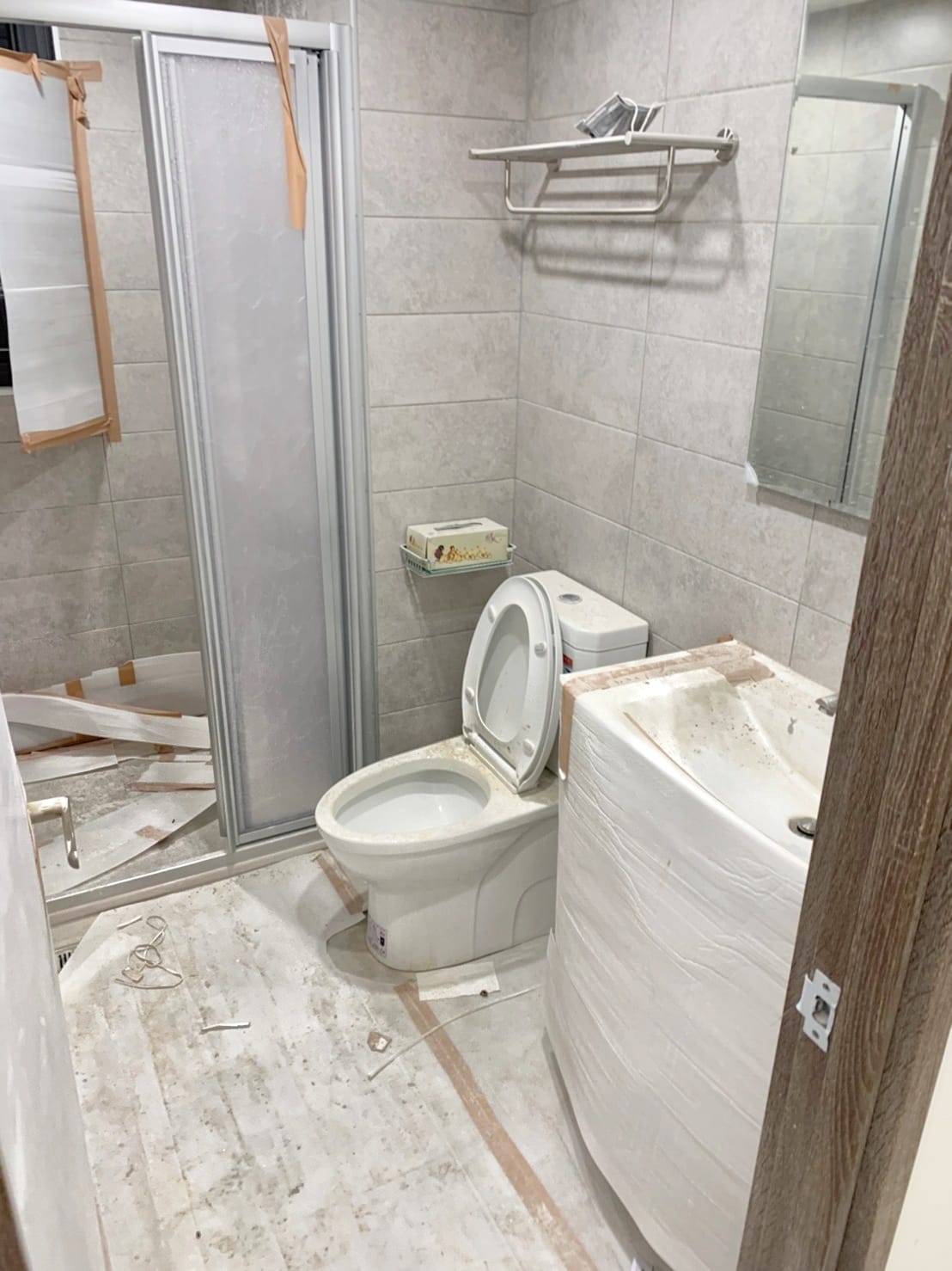 多處台中住宅裝潢案場完工後的衛浴空間細清成果。施工結束後的浴室常見檯面布滿白色粉塵、鏡面霧化失真,淋浴玻璃上留有膠帶痕與噴點,地面磁磚覆著泥漬、水痕與粗污。水龍頭與五金因粉塵附著而呈現失去光澤的霧面狀態,有些案場甚至可見泥作流痕、鐵銹色污漬與拆保護膜後殘留的膠印。