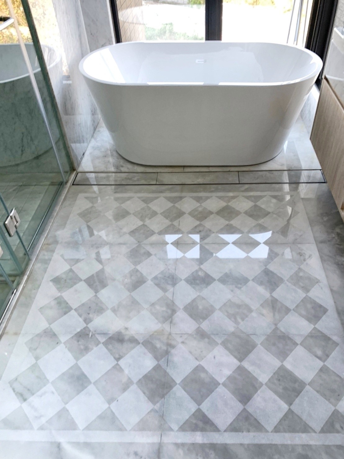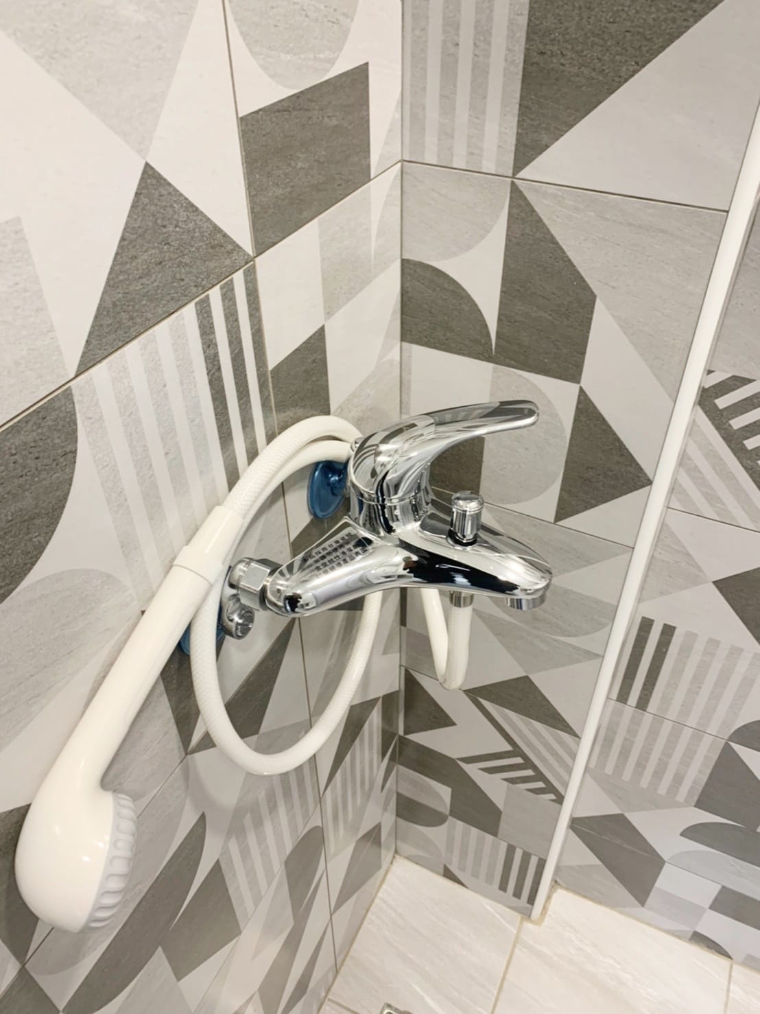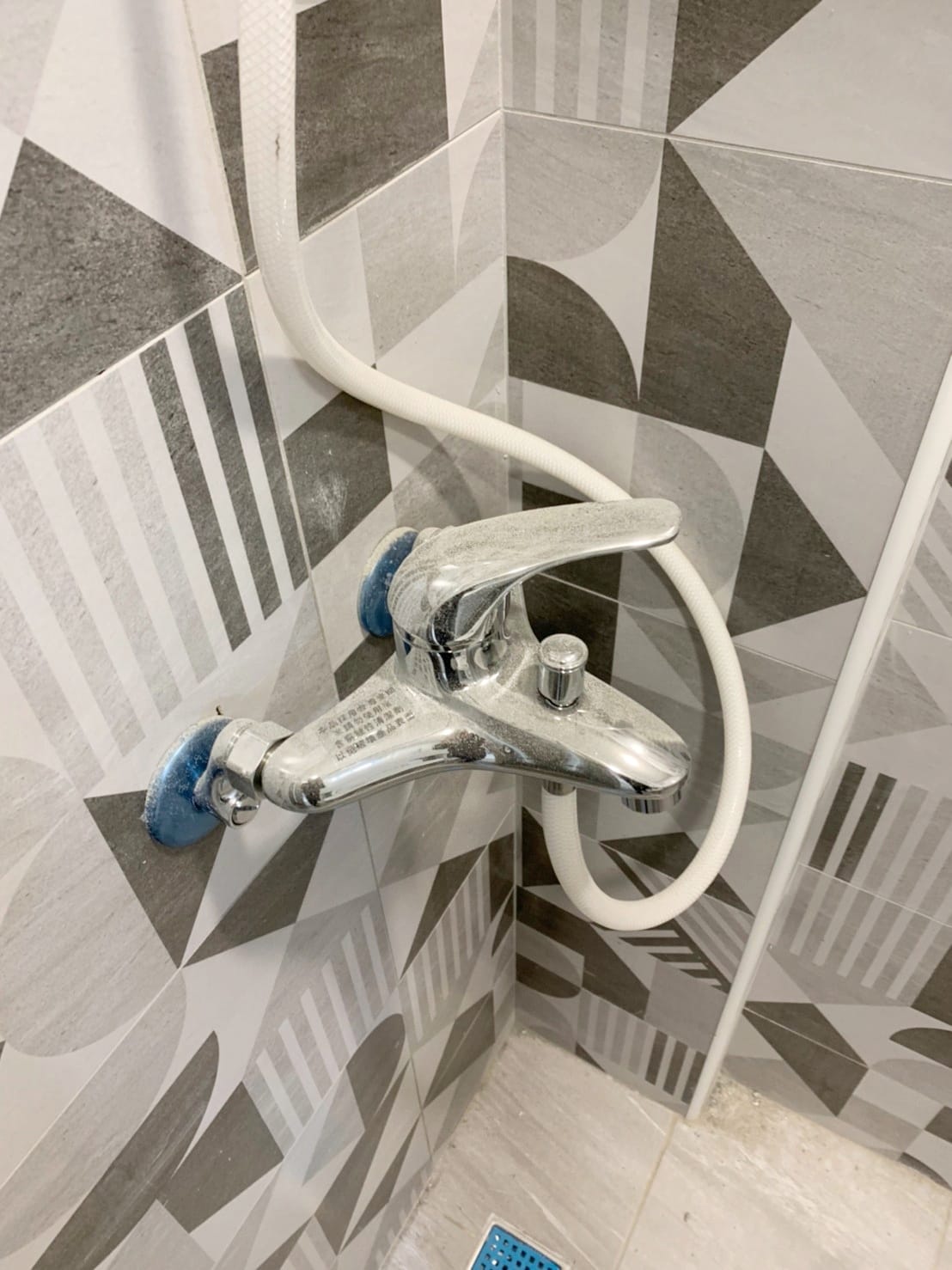 多處台中住宅裝潢案場完工後的衛浴空間細清成果。施工結束後的浴室常見檯面布滿白色粉塵、鏡面霧化失真,淋浴玻璃上留有膠帶痕與噴點,地面磁磚覆著泥漬、水痕與粗污。水龍頭與五金因粉塵附著而呈現失去光澤的霧面狀態,有些案場甚至可見泥作流痕、鐵銹色污漬與拆保護膜後殘留的膠印。