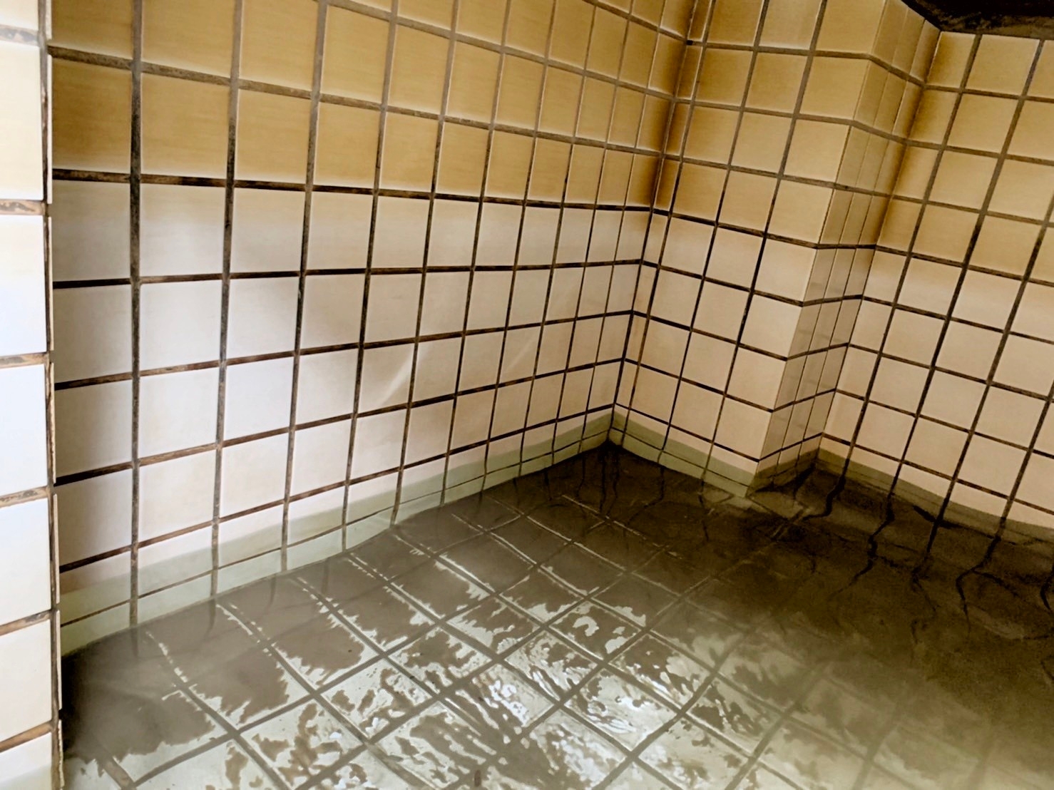 水塔因長期未深度清洗,底部與壁面積有明顯沉積物、鐵鏽水痕、水垢與泥沙殘留。