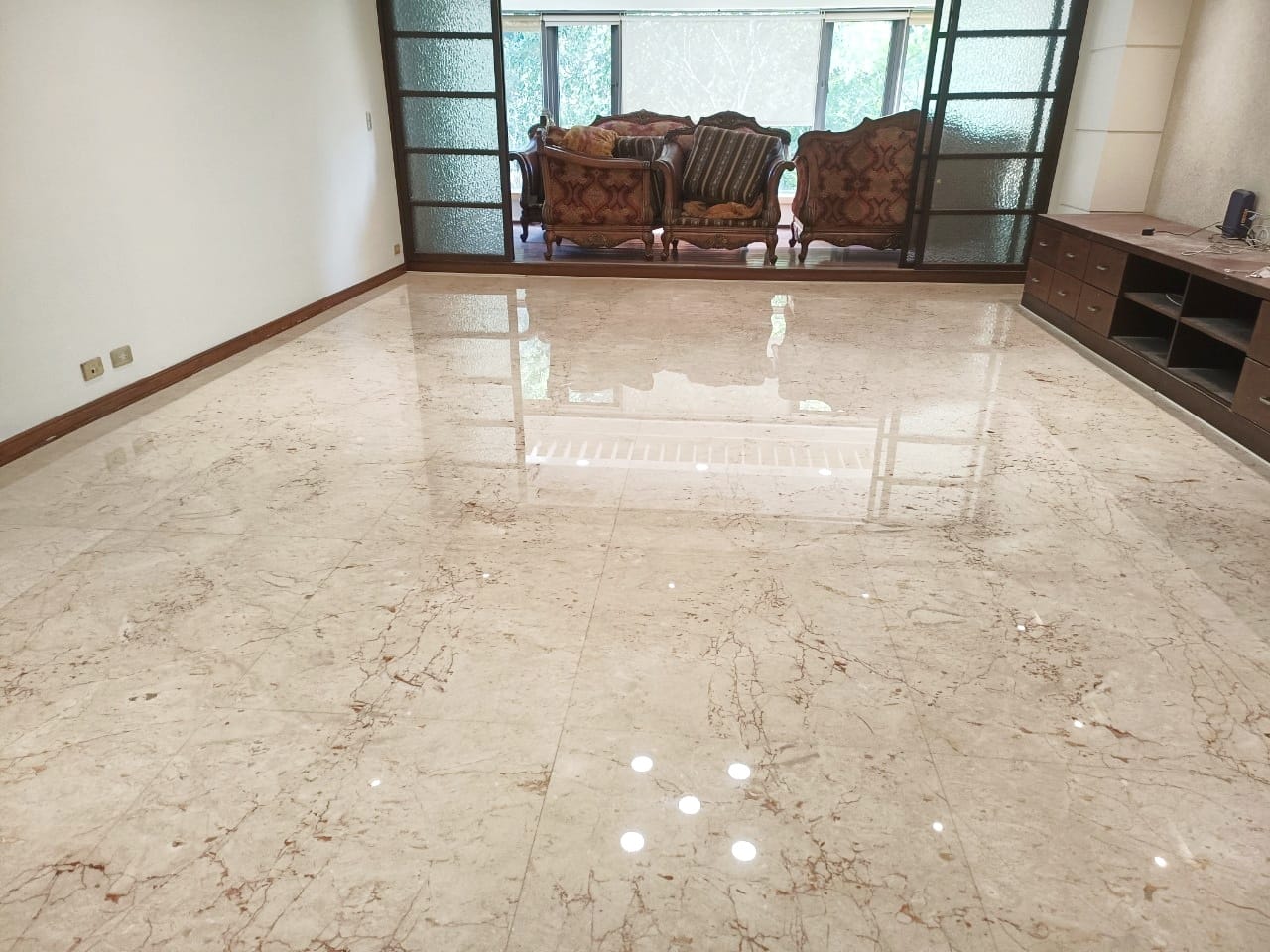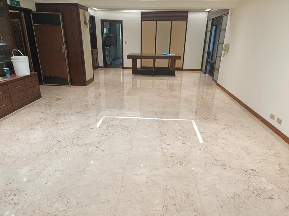 天然大理石使用多年後,地坪易出現刮痕、孔洞、晶化層霧化與反光度下降等問題。由潔管家協助進行完整的石材美容作業,包含補縫補洞、研磨整平、拋光與晶化,使地面恢復平整度與通透亮澤,呈現如新屋般的乾淨質感。
