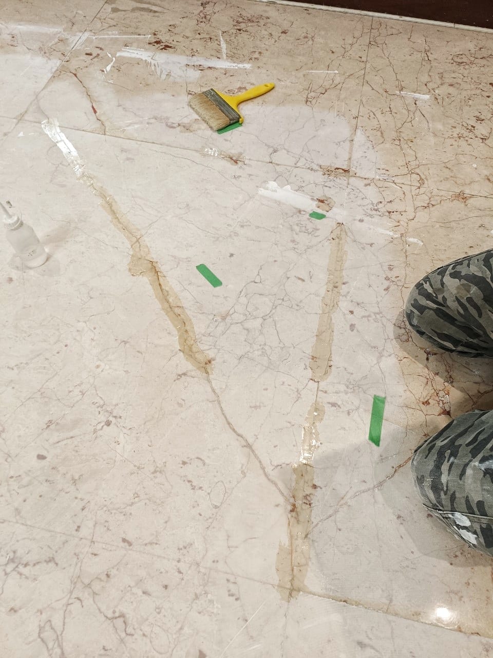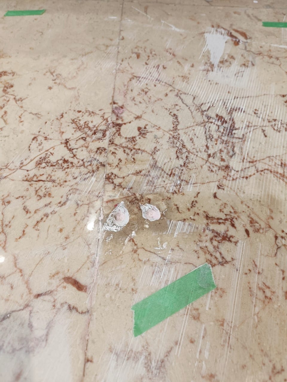 台中住宅大理石地坪的整體石材美容工程,施工區域包含客廳、玄關及多處走道。因石材使用多年,地面可見裂縫、孔洞、刮痕與接縫老化等問題,因此以補縫補洞、研磨整平與亮光處理作為主要施作流程。