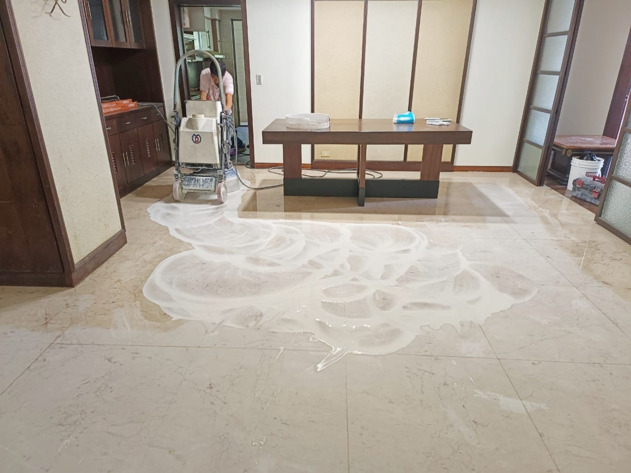 施作前,技師逐一標示石材受損位置,以樹脂填補裂縫與孔洞,使各區保持一致的平整度。隨後透過機械研磨依序進行粗磨、細磨與拋光,使刮痕減輕並去除舊有黯沉層,讓石材紋理回復清晰。研磨完成後,再以晶化方式加強表面亮度與保護性,使整體地坪呈現均勻、滑順且具反射度的質地。